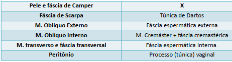 1) Túnica de Dartos 2)Fáscia espermática externa 3) M. cremáster + fáscia cremastérica 4) Fáscia espermática interna 5)Processo ( túnica) vaginal