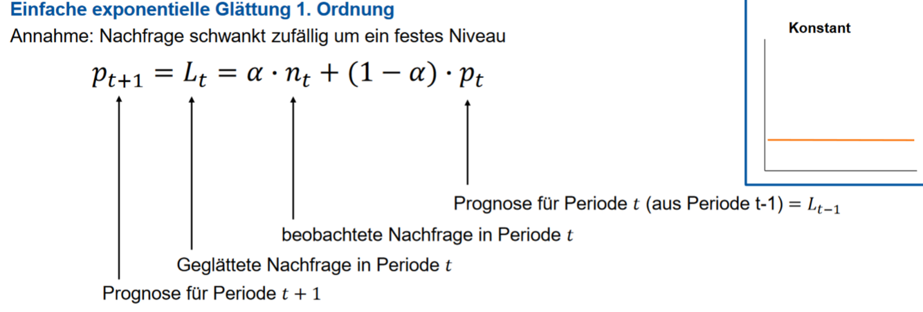 Geben sie die Formel für die Exponentielle Glättung 1. Ordnung an. Bennen sie dabei die einzelnen Parameter.