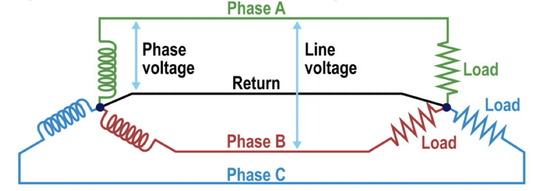 Each pair of stator coils is connected at one end to a common star, or neutral point and at the other end to the output, through a load and then back to the star connection through a return line