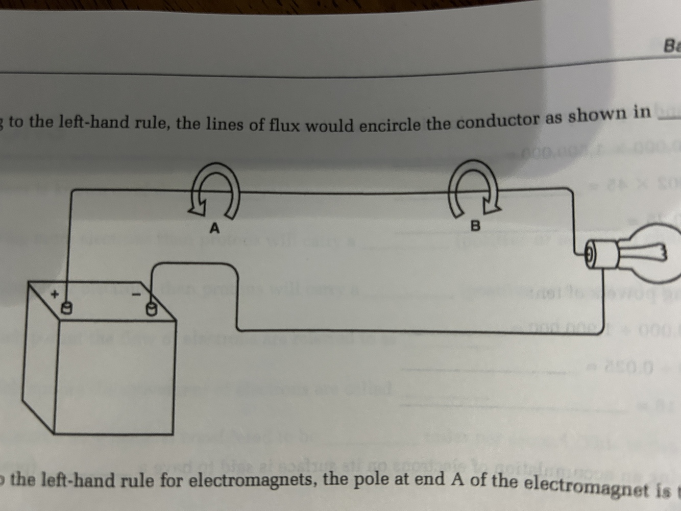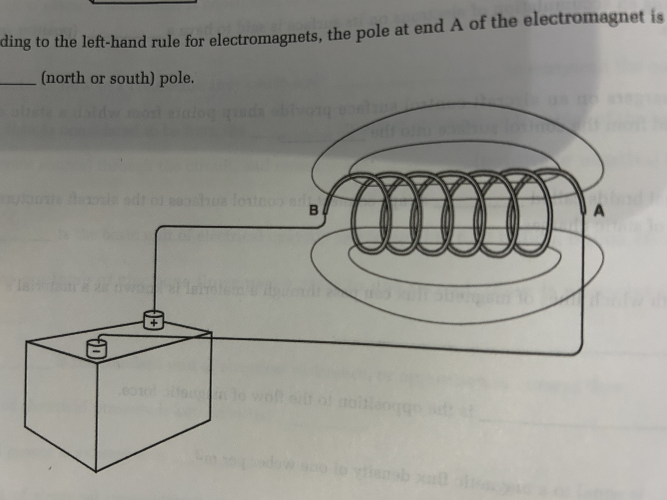 According to the left-hand rule for electromagnets, the pole at end A of the electromagnet is the _____ pole.