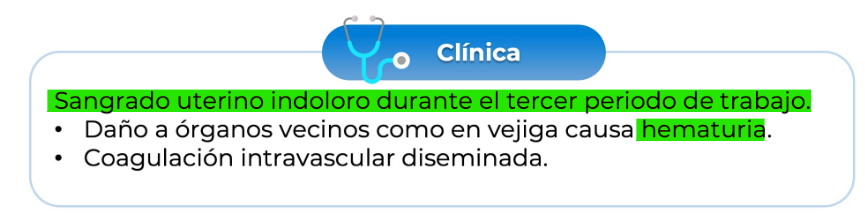 Sangrado uterino indoloro en el tercer periodo de parto ( alumbramiento ) asociado a hematuria por invasión de vellosidades a vejiga