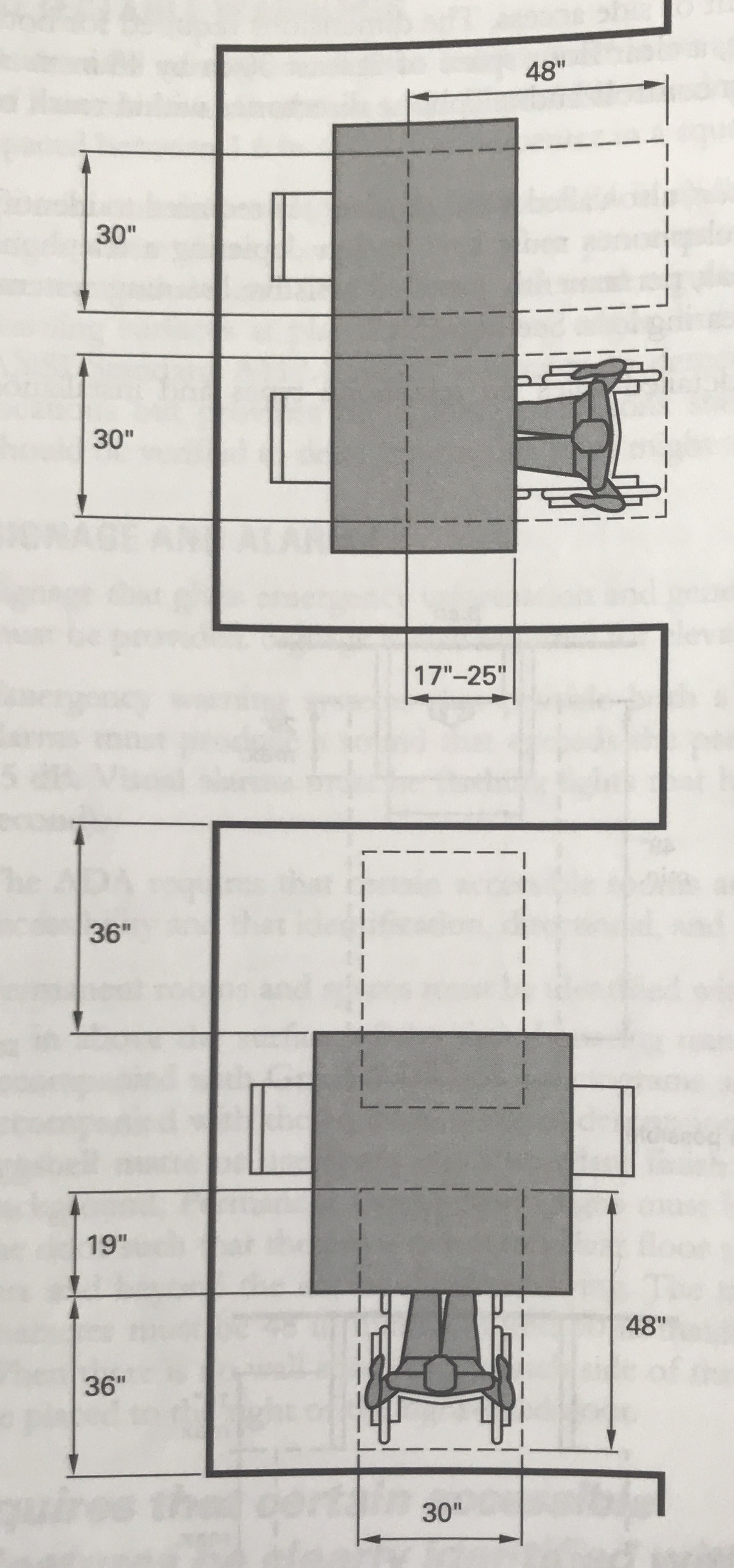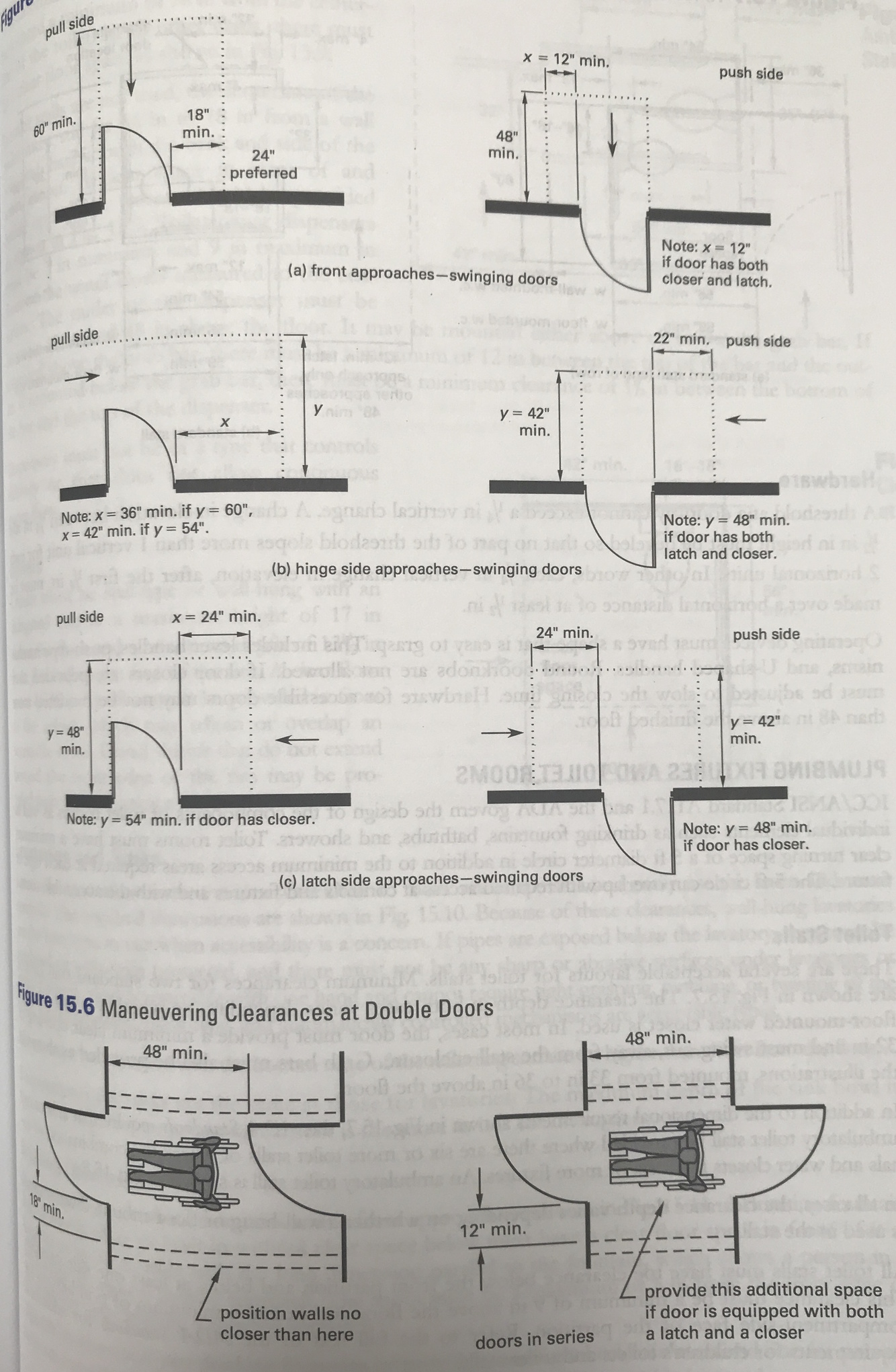 must have adequate maneuvering clearances at operational side - for front approaches: pull side is 18” min, 24” preferred, with depth of 60” - push side is 12” min if has a latch and closer with 48” depth
