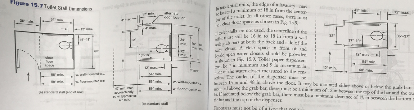 clear floor space (wc can protrude into, counted from back of wall) is 56” deep for wall mounted wcs, 59” for floor mounted wcs with 60” width