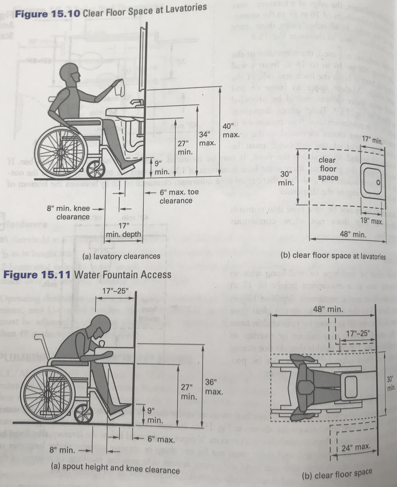 urinals must be at least 13.5” deep, have extended lip, be max 17” AFF, have a clear space of 30x48