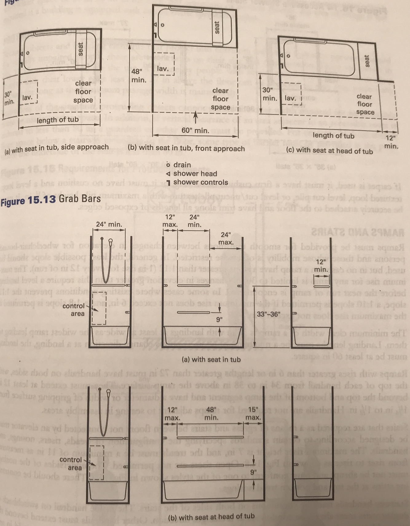 in-tub seat req, near controls, also grab bars, no enclosure tracks on tub rim, enclosure can’t interfere w wheelchair transfer or operation control