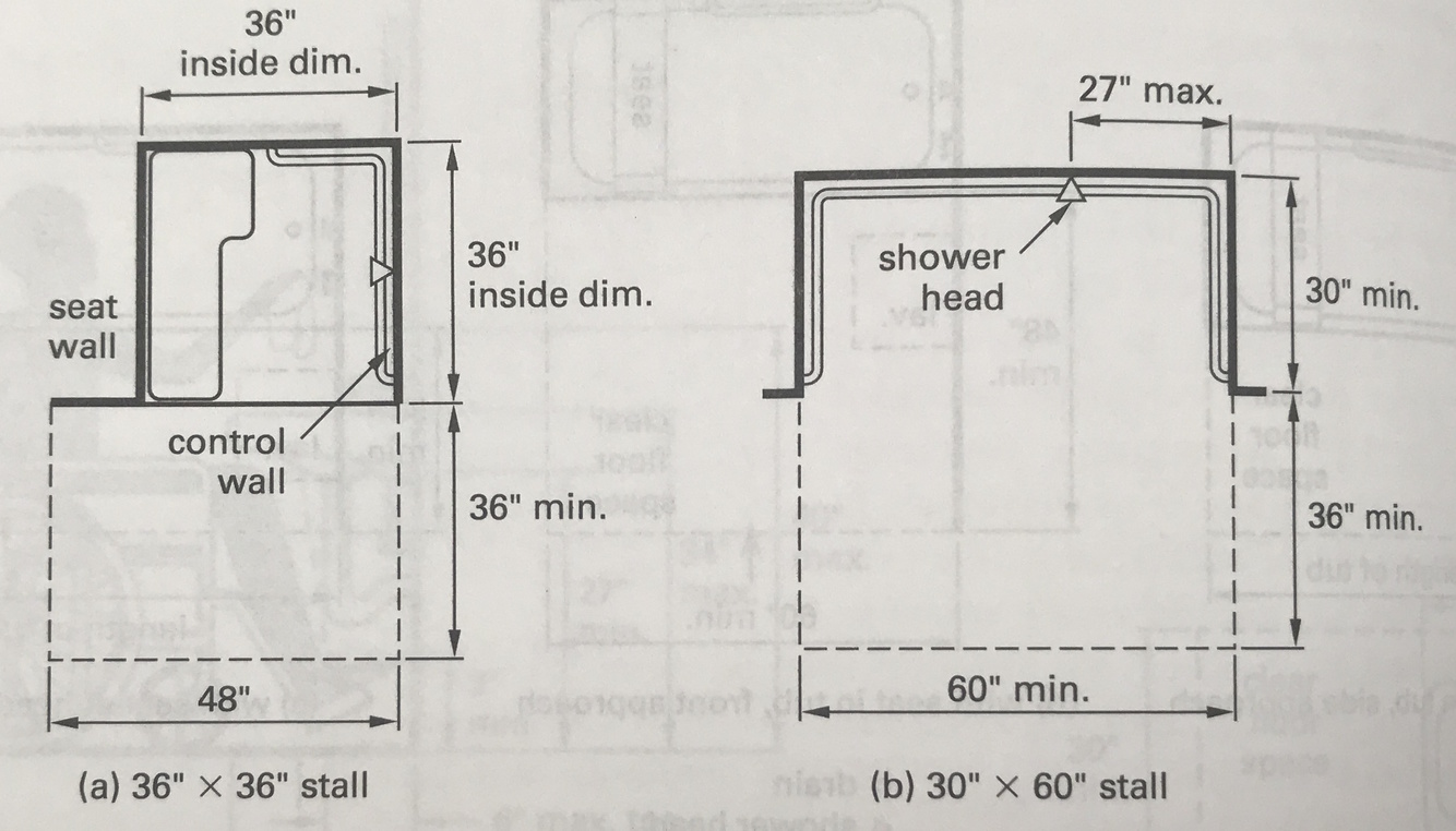 either 36x36 stall (seat req) or 30x60 stall (folding seat req)