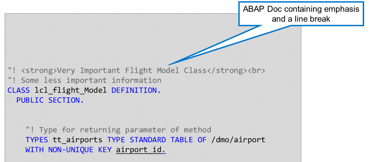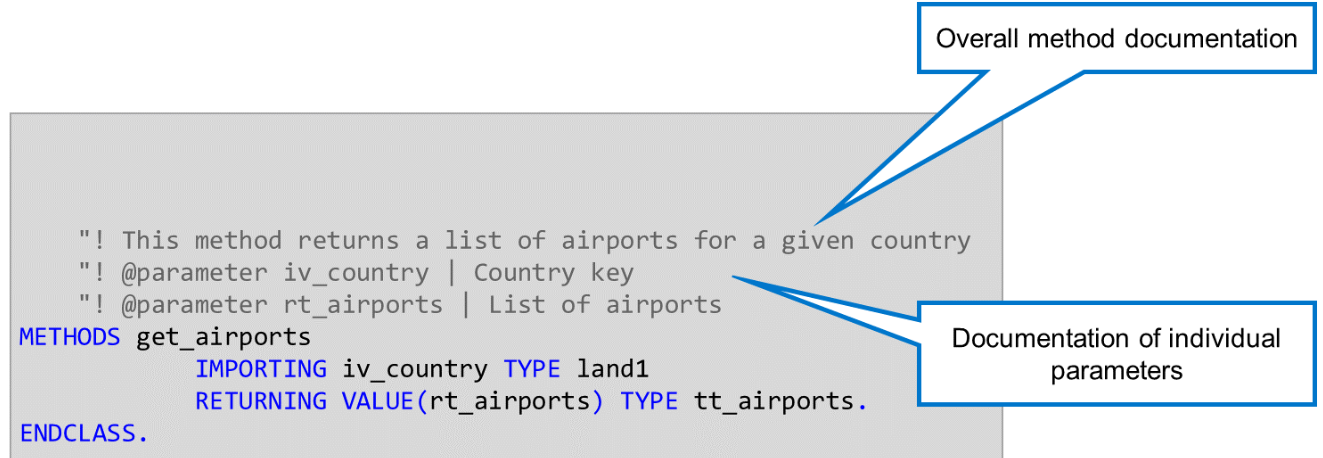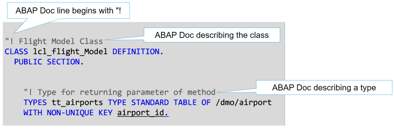 ABAP Doc comments precede the elements they document and start with the characters “!. These comments provide documentation for various elements in ABAP code. Additionally, if ABAP Doc comments are placed in positions where they are not allowed, the system displays a syntax warning, and the documentation is ignored.