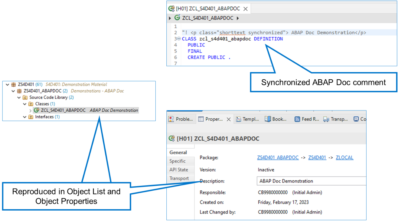 To ensure that an ABAP Doc description of an object is replicated in the object properties and the object list, use a paragraph tag <p> with the addition class=”shorttext synchronized”.