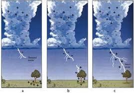 Clouds contain ice. As the cloud moves the ice particles collide together and this results in a negative charge being built up at the bottom of the cloud (and a positive charge at the top). As this charge increases the voltage increases. Eventually there is enough voltage to create a bolt of lightning and the electrons travel in a powerful stream towards the ground.