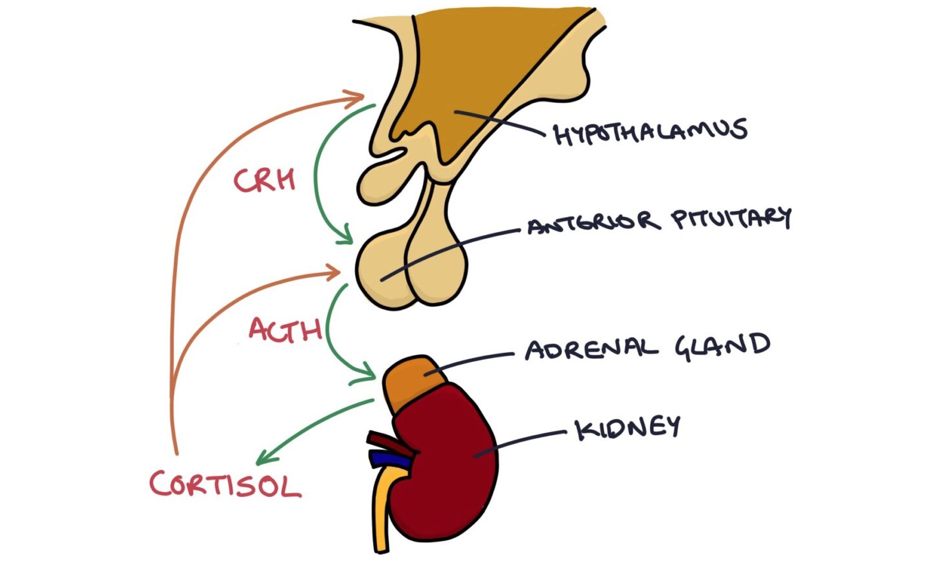 -the hypothalamus produces CRH which triggers the anterior pituitary to produce ACTH which triggers the adrenal glands to produce cortisol