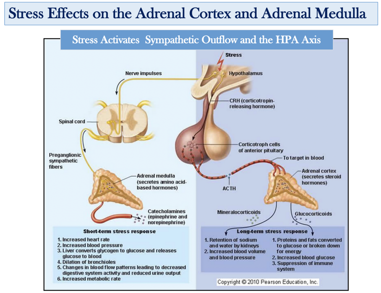 Discuss the short term and long term bodily responses to stress and how the adrenal gland is involved in these responses.