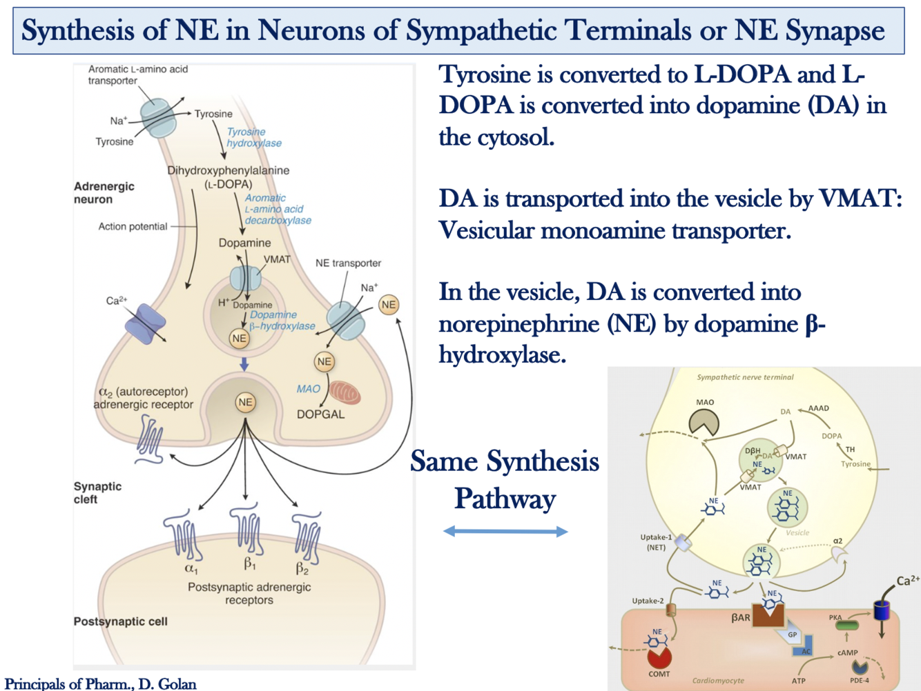 Tyrosine is brought into neuron terminal –> converted to LDOPA by tyrosine hydroxylase –> converted to dopamine –> dopamine loaded into vesicles by VMAT –> inside vesicle it is converted to NE –> NE released