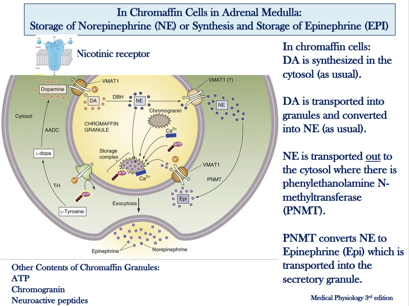 Tyrosine –> LDOPA – (tyrosine hydroxylase) –> Dopamine –> VMAT moves dopamine from cytosol into chromaffin granule –> DA – (dopamine beta hydroxylase) –> NE