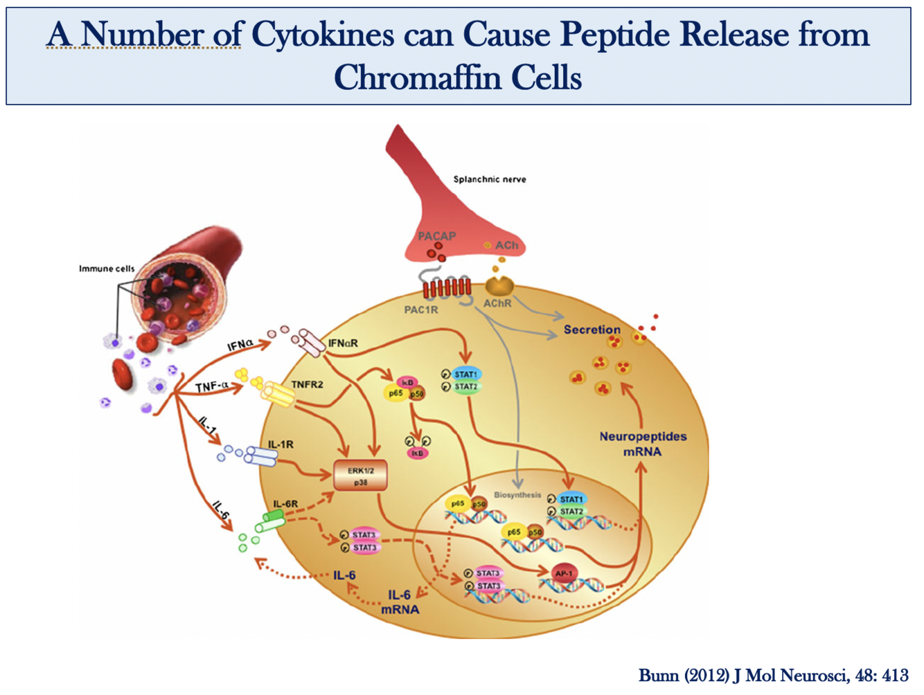 Cytokines can cause chromaffin cells to release neuropeptides –> which then go to stimulate immune tissues