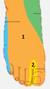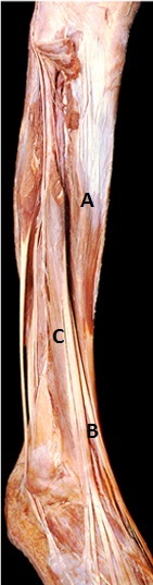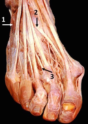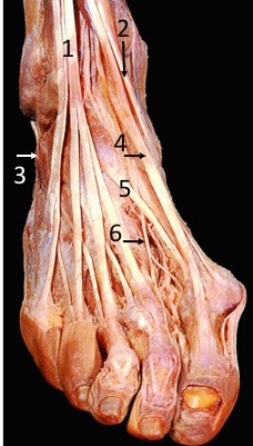 Common fibular nerve: anterior compartment of leg (via deep branch), lateral compartment of leg (via superficial branch), extensor digitorum brevis, extensor hallucis brevis