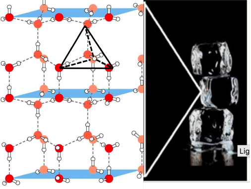 A água forma 4 ligações de hidrogênio com moléculas vizinhas de modo que ela fica no centro do tetaédro formando uma estrutura aberta.