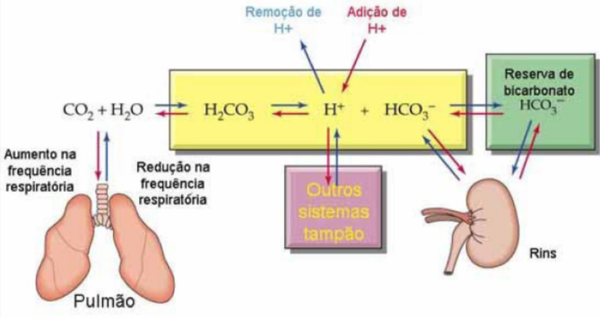 Retirada ou adição de H+ por um equilíbrio entre a formação de Bicarbonato e CO2 baseado na dissociação do ácido carbônico, o CO2 é adquirido por vias respiratórias enquanto o bicarbonato é armazenado em grande parte nos rins para eventuais necessidades.
