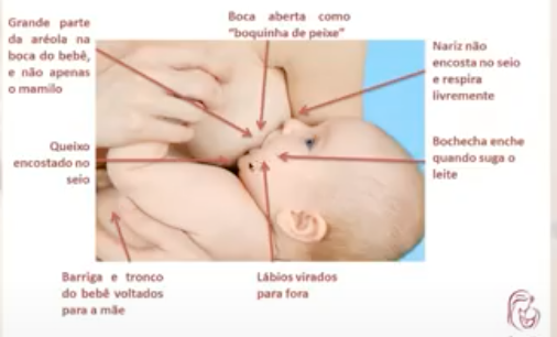 Pega correta: bebê deve ordenhar os seios lactíferos (ampolas de armazenamento - dilatação dos ductos) que ficam abaixo da aoréola: leite seja ejetado facilmente e em quantidade satisfatória