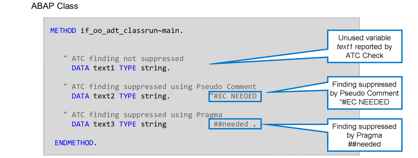 Pseudo Comments are specific comments added at the end of source code lines containing the finding. For example, “#EC NEEDED” is used to suppress Extended Check findings. Pseudo Comments are not visible to the ABAP syntax check or compiler but influence ATC.