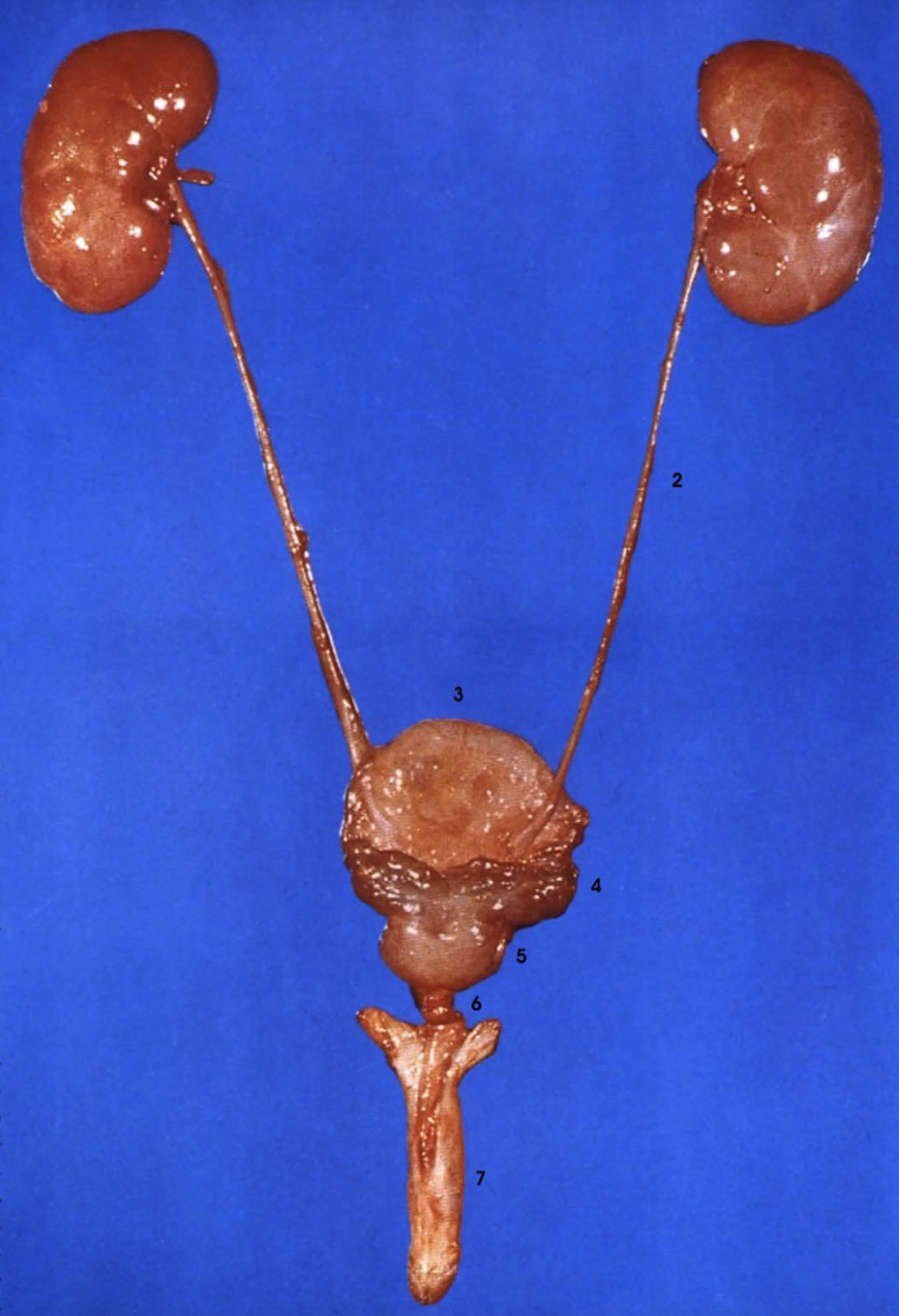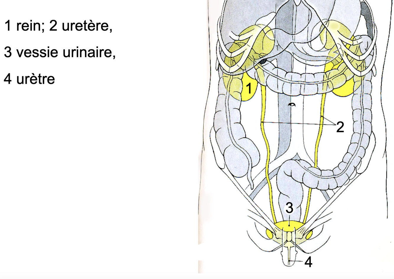 Pyramides de Malpighi/Ferrein → calices mineurs → calices majeurs → bassinet reinal → uretère → orifice urétéral → vessie → col de la vessie → urètre prostatique → urètre membraneuse → urètre spongieuse (fosse naviculaire) → Extérieur