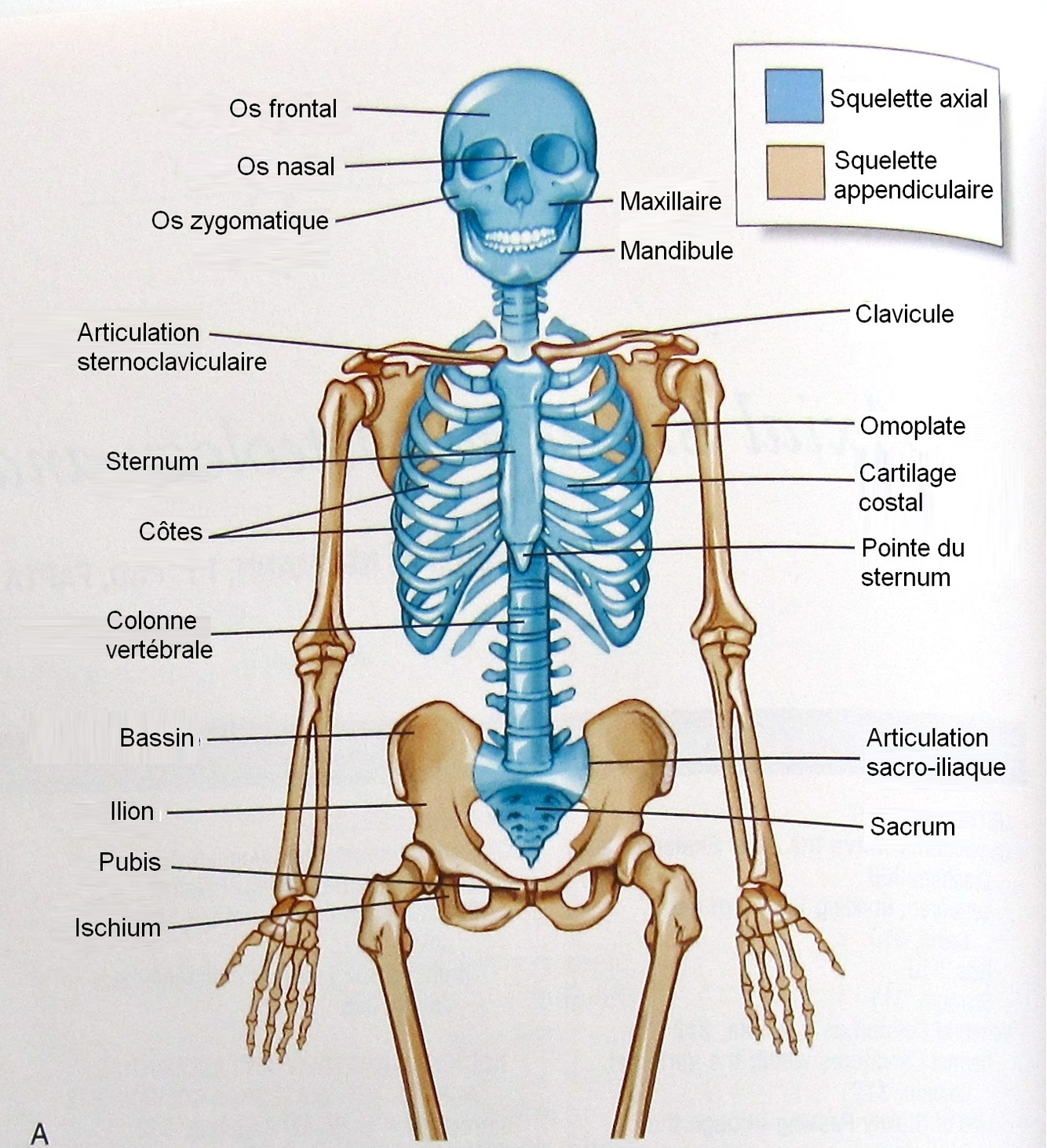 Il est divisé en squelette axial et squelette appendiculaire. Le squelette axial est en fait le squelette du tronc et du crâne et le squelette appendiculaire est le squelette des membres.