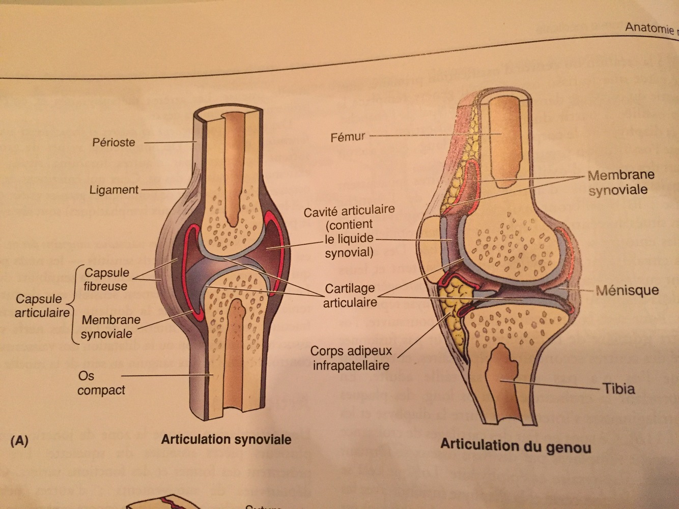 Les extrémités osseuses sont recouvertes d’un cartilage; elles sont unies par une enveloppe de collagène (capsule articulaire) qui délimite une cavité contenant du liquide synovial. Les articulations diarthrose (appelées synoviales) bougent donc bcp. C’est surtout celles-ci qui sont atteintes dans l’arthrite.
