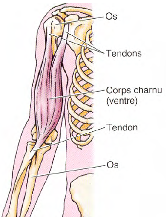 Le corps charnu ou le ventre au centre, et les tendons aux extrémités attachés sur les os.