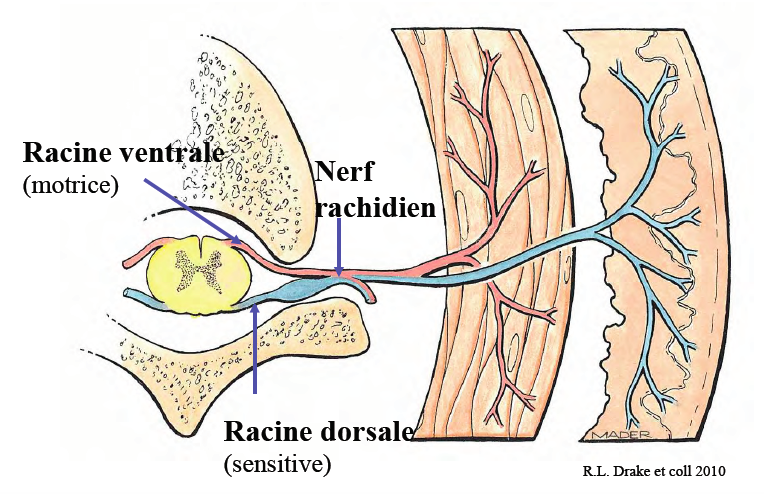 On parle surtout du système périphérique, soit les nerfs rachidiens et les nerfs crâniens. Il faut savoir que le nerf rachidien est mixte. La racine ventrale est motrice alors que la racine dorsale est sensitive.