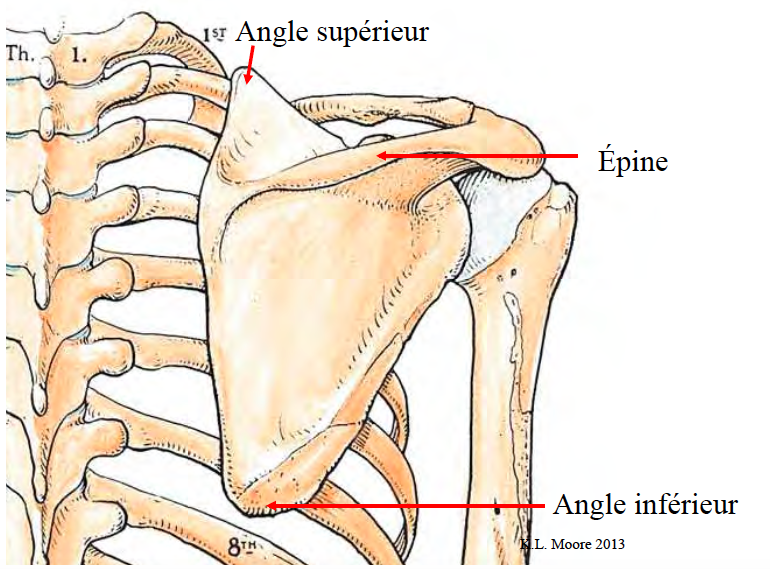 En postérieur, on voit l’angle supérieur ainsi que l’angle inférieur de la scapula, ainsi que son épine.