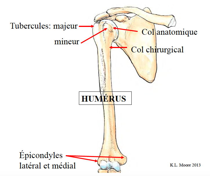 Il y a aussi deux col. Le col anatomique est entre la tête de l’humérus et les tubercules alors que le col chirurgical se situe sous l’épiphyse de l’os.