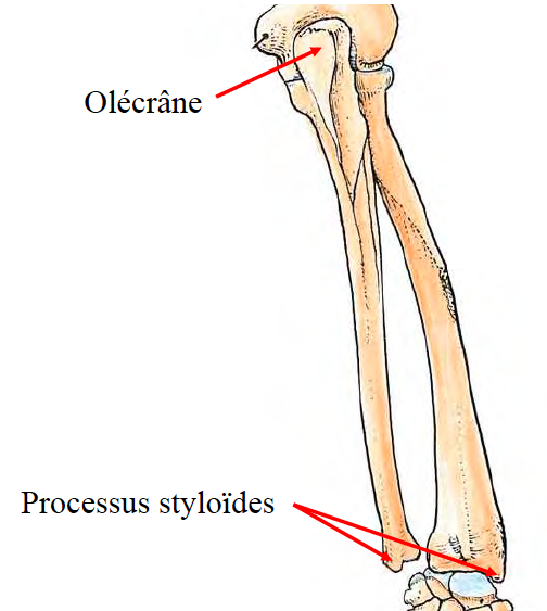 En postérieur, on trouve aussi les processus styloïde (à l’articulation de la main) sur chaque os.