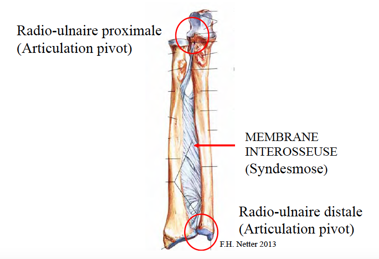 Dans l’avant bras on trouve la membrane interosseuse qui est une syndesmose. Enfin, on a l’articulation radio-ulnaire distale près du poignet qui est aussi une articulation pivot.