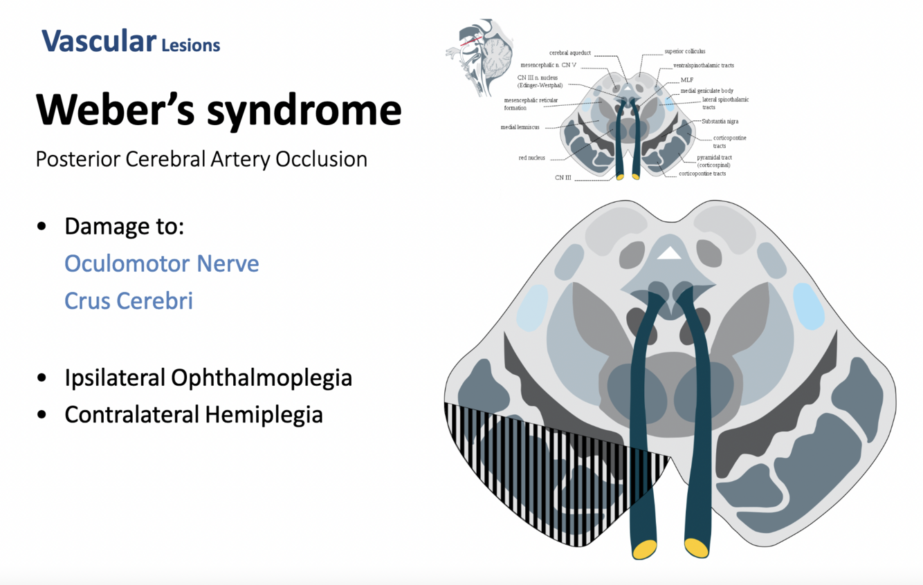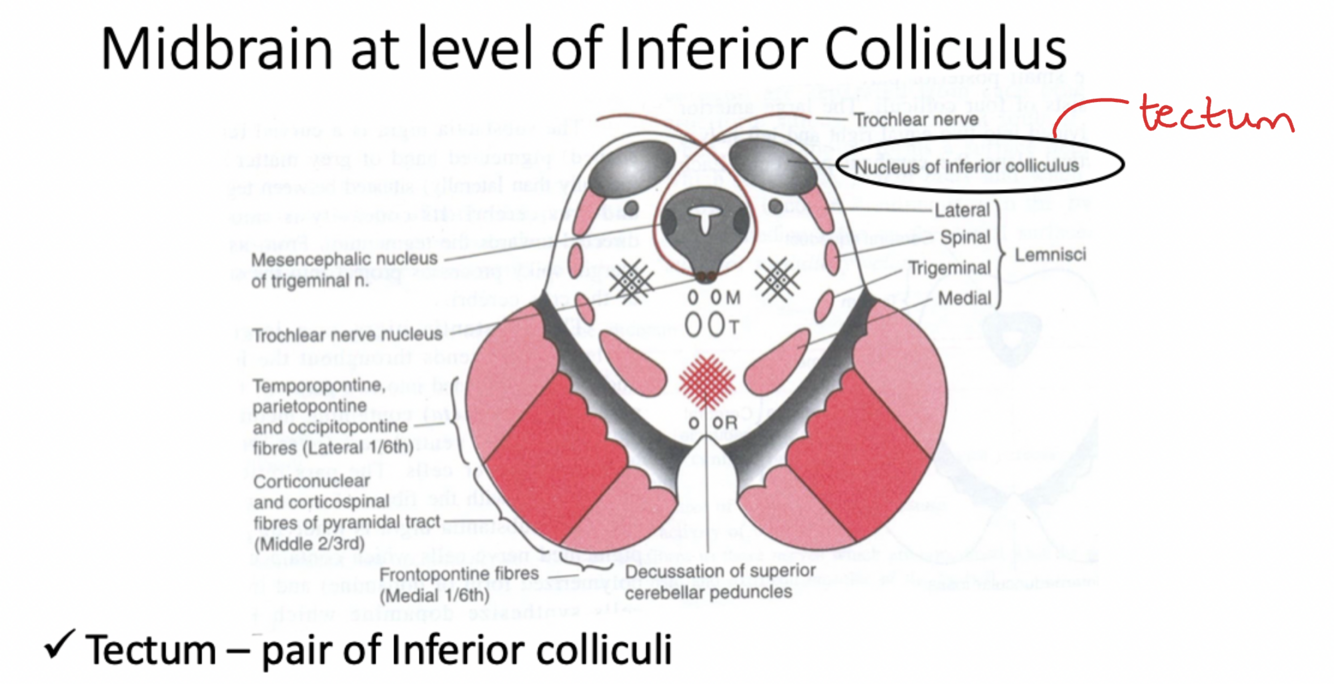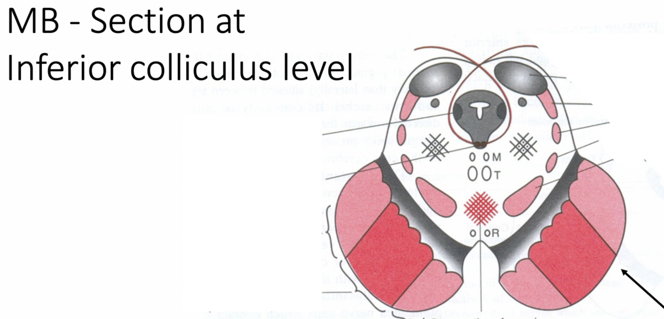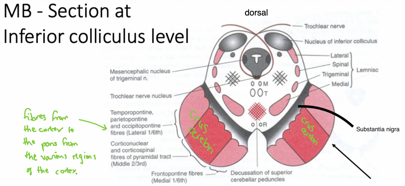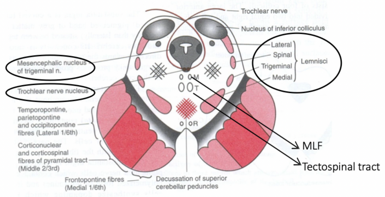 Features Common with previous section: Crus cerebri, substantia nigra, lemnisci (not Lateral lemniscus)