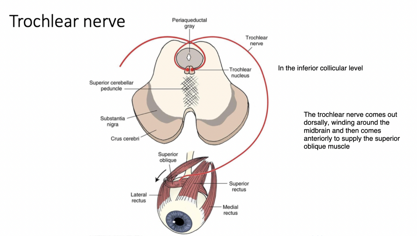 The trochlear nerve comes out dorsally, winding around the midbrain and then comes anteriorly to supply the superior oblique muscle
