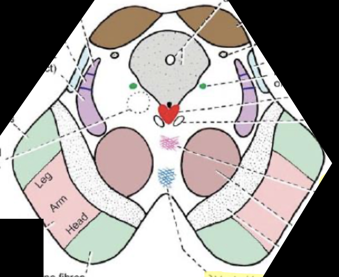 Ascending fibres terminate in red nucleus, thalamus, midbrain Reticular formation (RF)