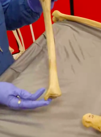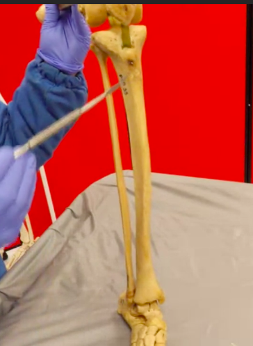 Tibial tuberosity (with medial and lateral tibial condyles either side) - attachment site of quads via patella tendon