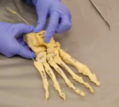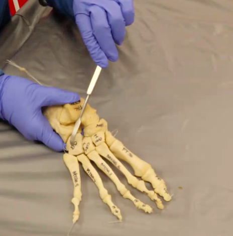 There are three cuneiform bones: The medial cuneiform (also known as first cuneiform) is the largest of the cuneiforms. It is situated at the medial side of the foot, anterior to the navicular bone and posterior to the base of the first metatarsal. Lateral to it is the intermediate cuneiform.