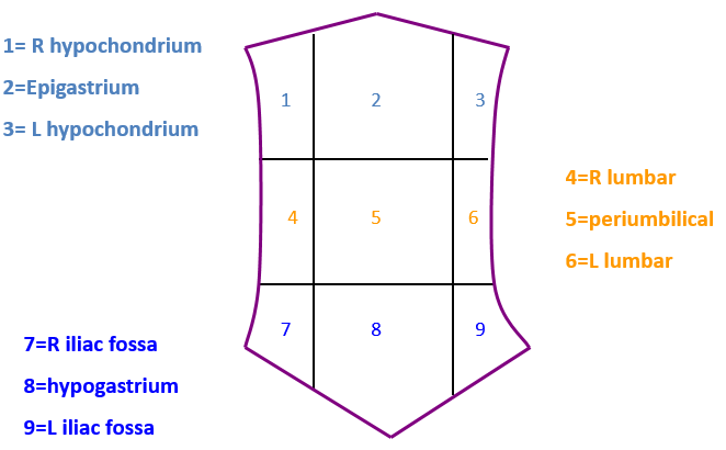 Horizontal lines are subcostal plane (superior) and transpyloric plane (inferior)