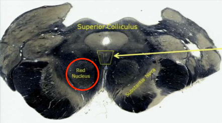Red nucleus, in the center of the rostral midbrain.