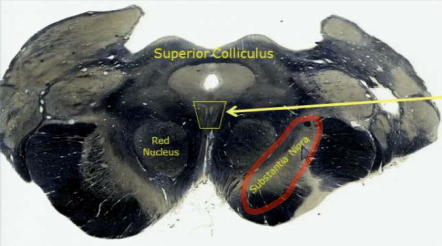 The pars compacta and pars reticulate of the substantia nigra, in the rostral ventral midbrain.