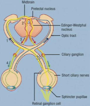 Light hits photoreceptors -> Retinal ganglion cells fire -> Some fibers go to lateral geniculate body, others go to the pre-tectal nucleus -> Pre-tectal axons go to the Edinger-Westphal nucleus (CN III) -> Bilateral Ciliary ganglion -> Bilateral sphincter pupillae