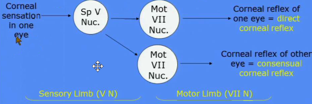 Touch cornea -> Long ciliary nerve -> Nasociliary nerve -> V1 (opthalmic) -> Trigeminal ganglion -> Trigeminal nerve -> Spinal Vth tract -> Spinal Vth nucleus -> Bilateral secondary axons to facial motor nucleus -> CN VII upper division -> Zygomatic nerves -> Palpepral part of orbicularis oculi -> Bilaterl blinking