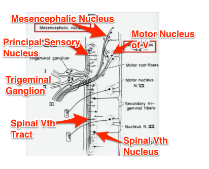 Afferent V3 fibers -> Mesencephalic nucleus -> Motor nucleus of V -> Efferent V3 fibers closes jaw