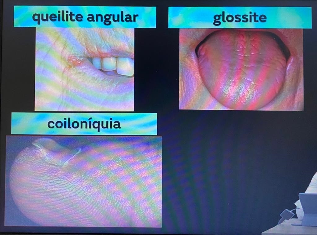 Carência nutricional: glossite, queilite angular, coitoniquia, PICA (perversão do apetite, pagofagia), disfagia Plummer-Vinson