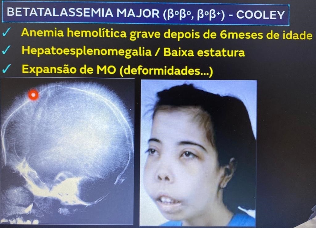 Ausência de beta-globulina, Anemia de Cooley, + grave, deformidades ósseas (facies em esquilo e cranio em cabeleira)
