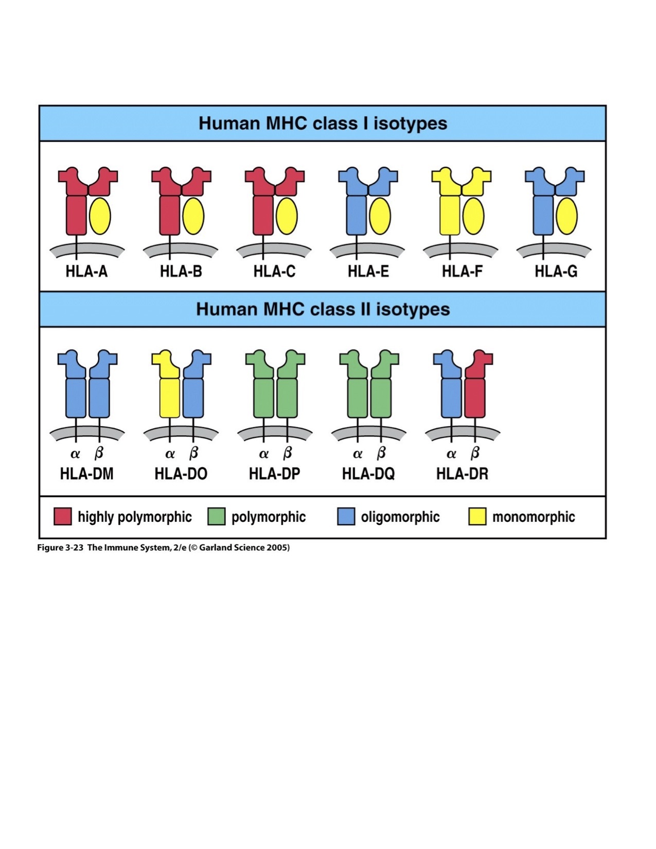 DP, DQ, DR (highly)- polymorphic, hundreds of allotypes