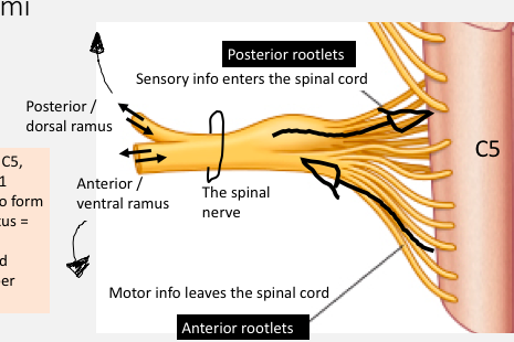 It splits into an ventral ramus and a posterior ramus that head to the respective sides of the body (these contain both motor and sensory info)