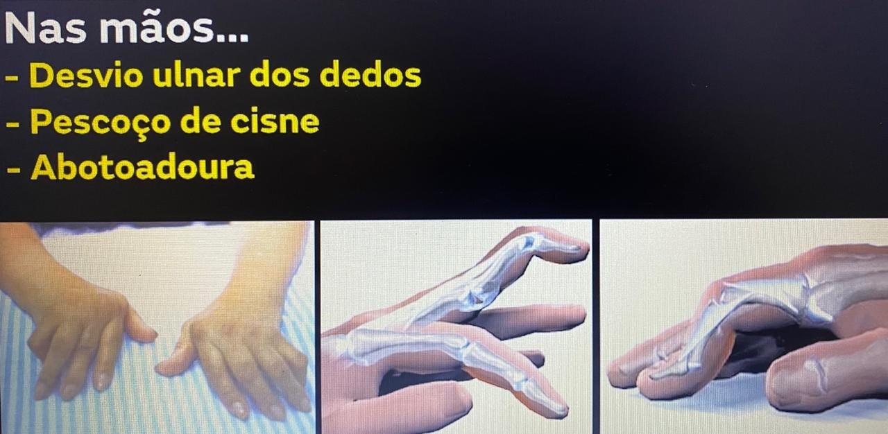 • Mão: desvio ulnar dos dedos, pescoço de cisne (flexão IFD, extensão IFP), abotoadura (flexão IFP, extensão IFD), Poupa IFD da artrite