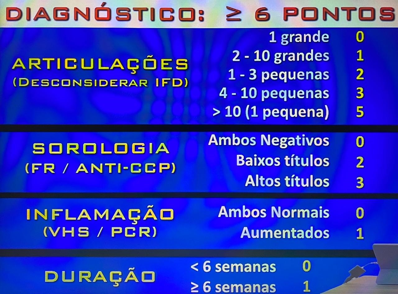 Mulher, meia idade, com dor em articulações há mais de 6 semanas, que se iniciaram em mãos, após em pés e depois em punhos, com rigidez matinal de mais de uma hora. Em mãos, possui desvio dos dedos para lateral e poupa articulação interfalangiana distal, além de concavidades em punho e metacarpofalangianas. Em joelho possui abaulamento posterior a região poplitea. Laboratorio com aumento de provas inflamatórias e de anticorpos especificos…