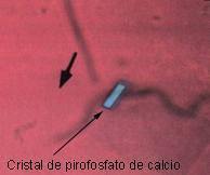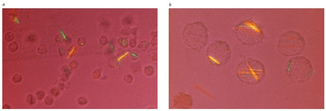 Cristais no interior de leucócitos com birrefringência NEGATIVA sob luz polarizada